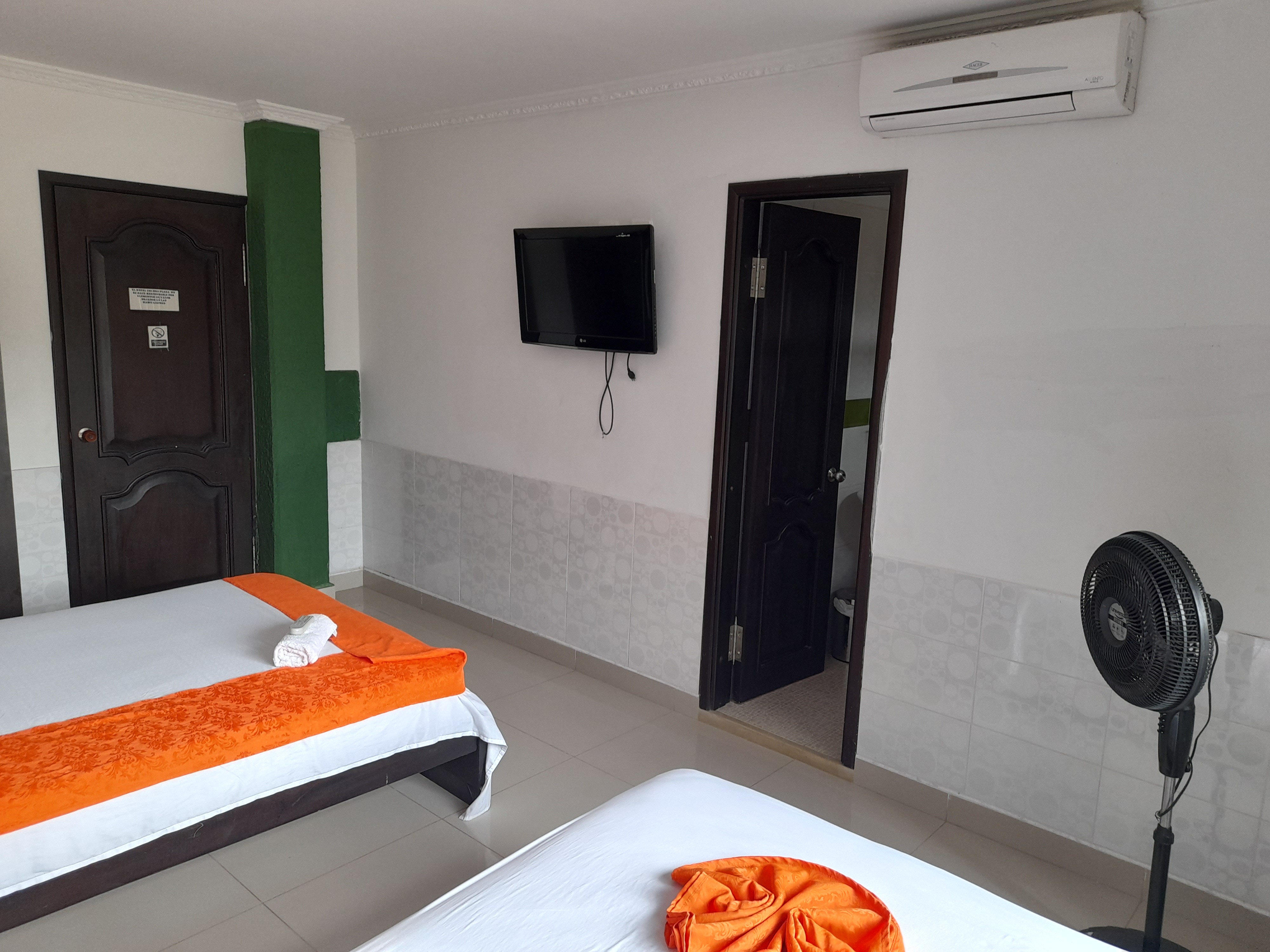 Habitación de 2 camas,1 doble y 1 sencilla, ventilador, nevera, armario, baño, ideal para 3 o 4 personas.